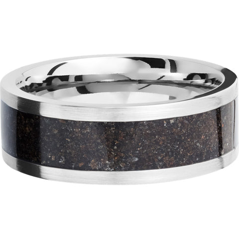 Titanium 8mm flat band with a mosaic inlay of black dinosaur bone. This beautiful product isn't always in stock. Our online inventory shows everything that we produce and some products need to be made from scratch along with vendor items that we don't produce. We will call or email letting you know if the piece is available or needs to be built along with if the product needs to be sized. Current estimated build times are between 6-8 weeks.