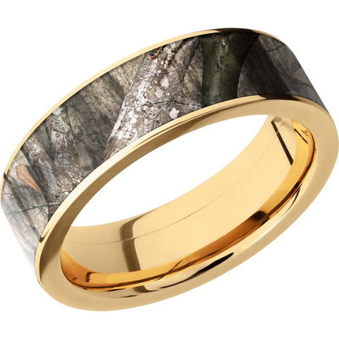 14K Yellow Gold 7mm flat band with a 6mm inlay of Mossy Oak Treestand Camo. This beautiful product isn't always in stock. Our online inventory shows everything that we produce and some products need to be made from scratch along with vendor items that we don't produce. We will call or email letting you know if the piece is available or needs to be built along with if the product needs to be sized. Current estimated build times are between 6-8 weeks.